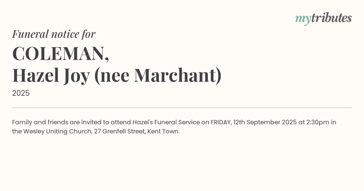 16°CFamily and friends are invited to attend Hazel's Funeral Service on FRIDAY, 12th September 2025 at 2:30pm in the