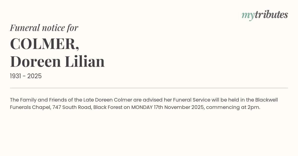 16°CThe Family and Friends of the Late Doreen Colmer are advised her Funeral Service will be held in the Blackwell Funerals Chapel, 747 South Road, Black Forest on MONDAY 17th November 2025, commencing at 2pm.