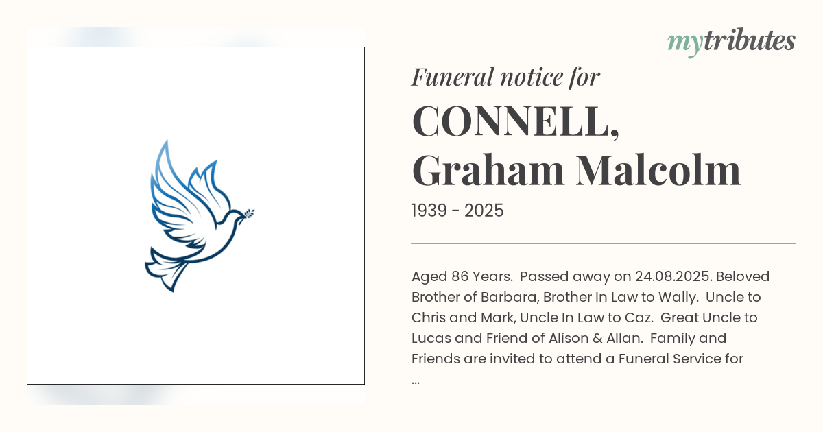 16°CAged 86 Years. Passed away on 24.08.2025. Beloved Brother of Barbara, Brother In Law to Wally. Uncle to Chris and Mark, Uncle In Law to Caz. Great Uncle to Lucas and Friend of Alison & Allan. Family and Friends are invited to attend a Funeral Service for Graham at George Hartnett Metropolitan Funerals Aspley, 782 Zillmere Rd, Aspley on Friday 3.10.2025 at 2pm.