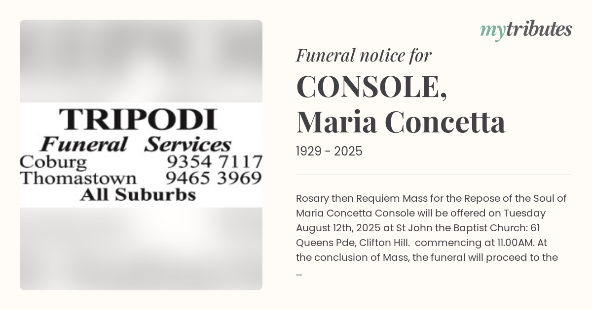 16°CRosary then Requiem Mass for the Repose of the Soul of Maria Concetta Console will be offered on Tuesday August 12th, 2025 at St John the Baptist Church: 61 Queens Pde, Clifton Hill. commencing at 11.00AM. At the conclusion of Mass, the funeral will proceed to the Melbourne General Cemetery for burial. College Cres, Parkville. Formal condolences will be accepted at the church.