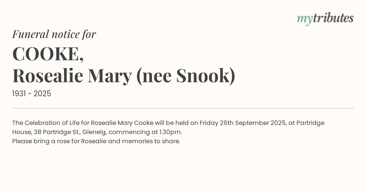 16°CThe Celebration of Life for Rosealie Mary Cooke will be held on Friday 26th September 2025, at Partridge House, 38 Partridge St., Glenelg, commencing at 1.30pm.