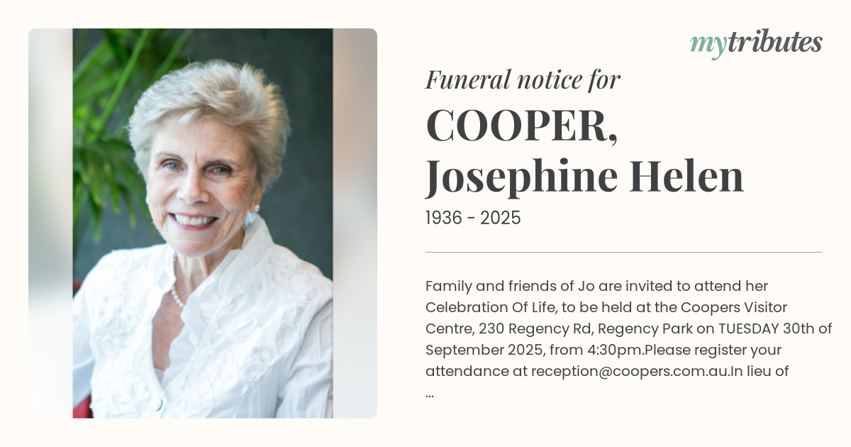 16°CFamily and friends of Jo are invited to attend her Celebration Of Life, to be held at the Coopers Visitor Centre, 230 Regency Rd, Regency Park on TUESDAY 30th of September 2025, from 4:30pm.