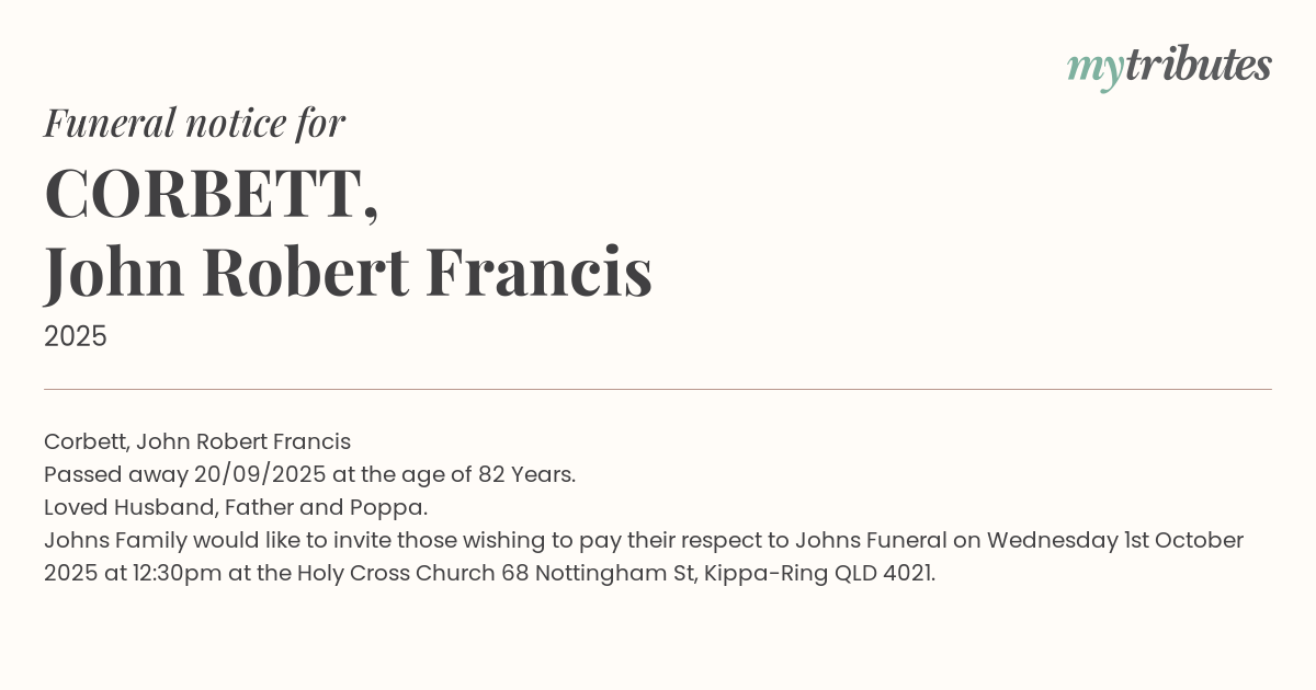 Johns Family would like to invite those wishing to pay their respect to John’s Funeral on Wednesday 1st October 2025 at 12:30pm at the Holy Cross Church 68 Nottingham St, Kippa-Ring QLD 4021.