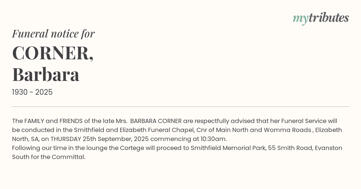 16°CThe FAMILY and FRIENDS of the late Mrs. BARBARA CORNER are respectfully advised that her Funeral Service will be conducted in the Smithfield and Elizabeth Funeral Chapel, Cnr of Main North and Womma Roads , Elizabeth North, SA, on THURSDAY 25th September, 2025 commencing at 10:30am.