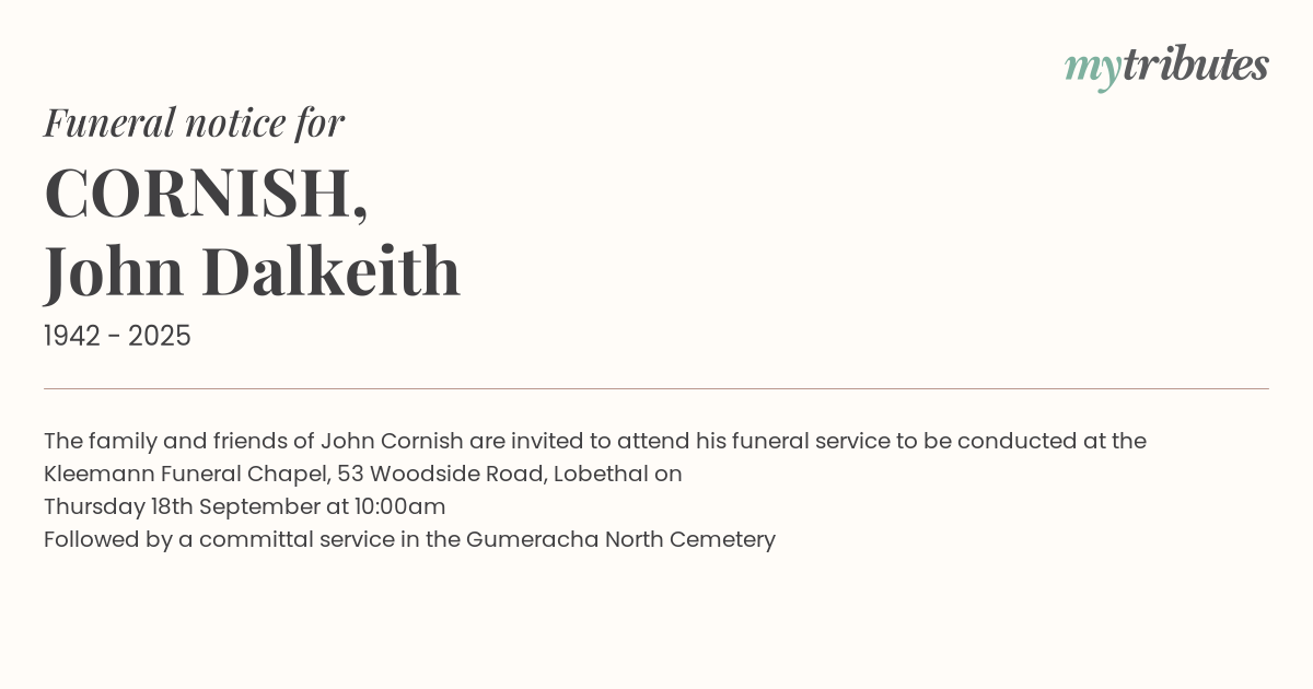 16°CThe family and friends of John Cornish are invited to attend his funeral service to be conducted at the Kleemann Funeral Chapel, 53 Woodside Road, Lobethal on Thursday 18th September at 10:00am