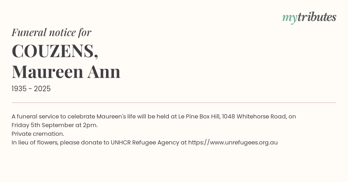 16°CA funeral service to celebrate Maureen's life will be held at Le Pine Box Hill, 1048 Whitehorse Road, on Friday 5th September at 2pm.