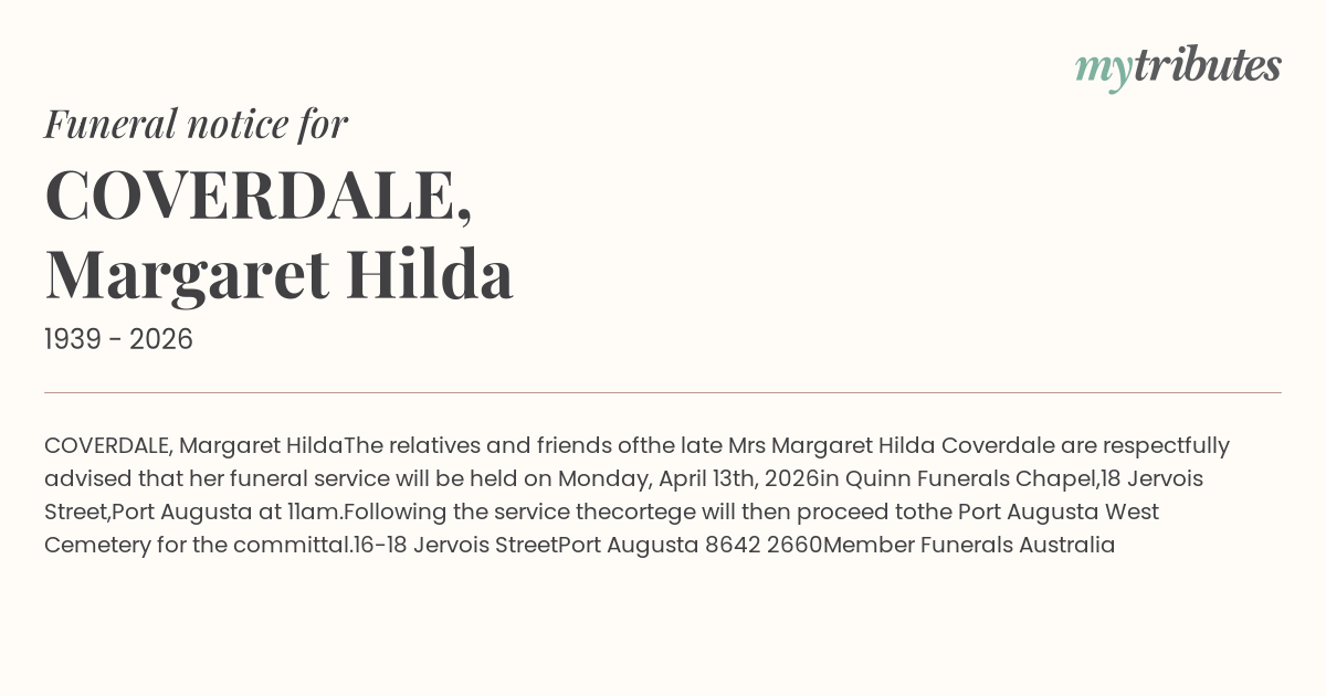 the late Mrs Margaret Hilda Coverdale are respectfully advised that her funeral service will be held on Monday, April 13th, 2026