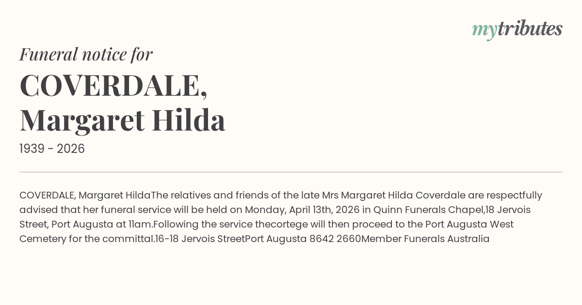 the late Mrs Margaret Hilda Coverdale are respectfully advised that her funeral service will be held on Monday, April 13th, 2026