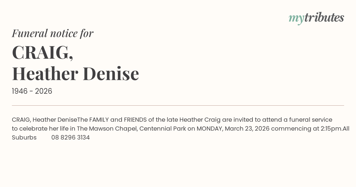 The FAMILY and FRIENDS of the late Heather Craig are invited to attend a funeral service to celebrate her life in The Mawson Chapel, Centennial Park on MONDAY, March 23, 2026 commencing at 2:15pm.