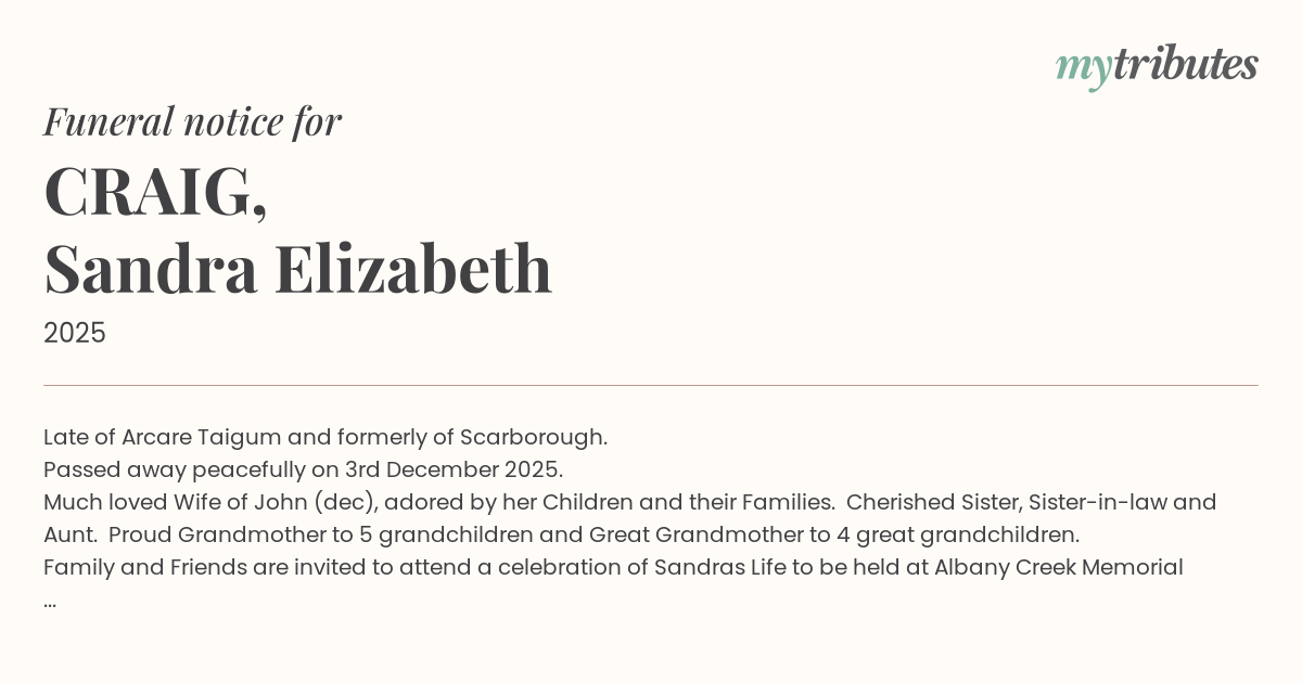 Family and Friends are invited to attend a celebration of Sandra’s Life to be held at Albany Creek Memorial Park in the Gardenview Chapel, Service commencing at 1:30pm, on Friday 12th December 2025.