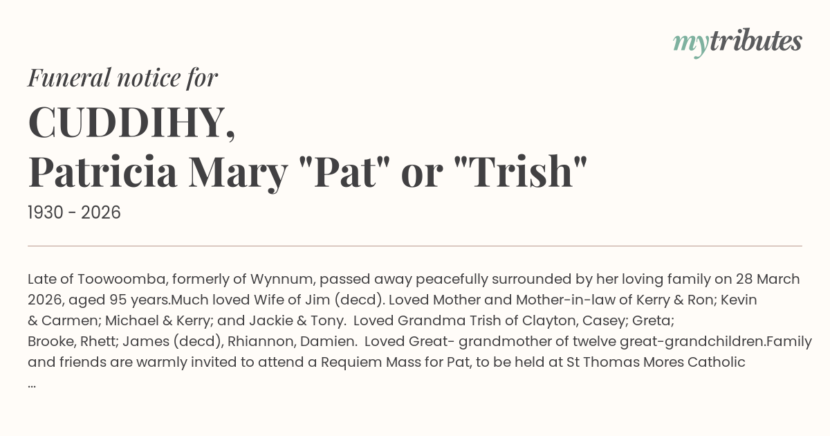 Family and friends are warmly invited to attend a Requiem Mass for Pat, to be held at St Thomas More’s Catholic Church, 71A Ramsay Street, South Toowoomba, service commencing at 11:00am Tuesday 7 April 2026, followed interment at the Toowoomba Garden of Remembrance Cemetery.