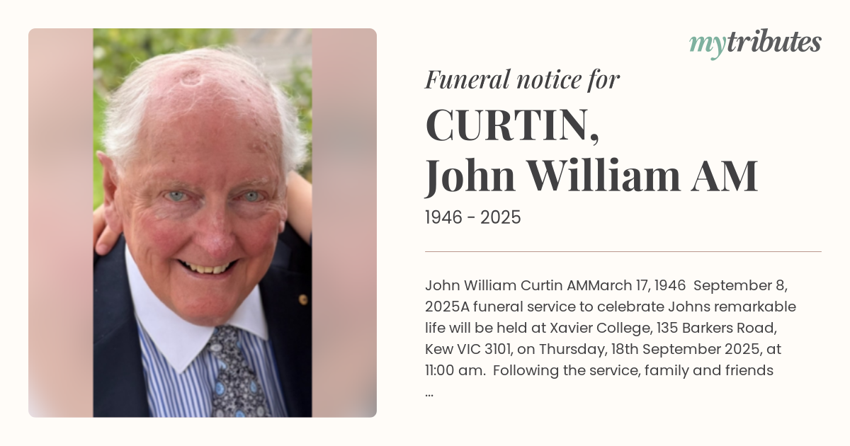 A funeral service to celebrate John’s remarkable life will be held at Xavier College, 135 Barkers Road, Kew VIC 3101, on Thursday, 18th September 2025, at 11:00 am. Following the service, family and friends are warmly invited to gather at Mister Bianco, 26 Cotham Road, Kew to share memories and celebrate his life. A private family burial will follow.