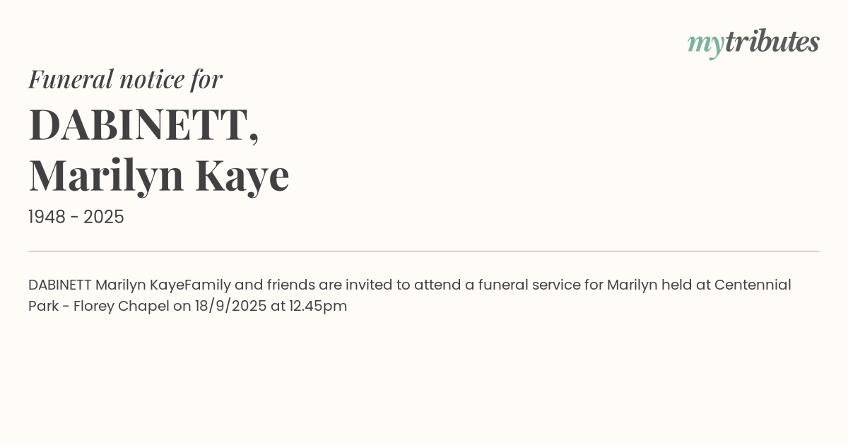 Family and friends are invited to attend a funeral service for Marilyn held at Centennial Park - Florey Chapel on 18/9/2025 at 12.45pm