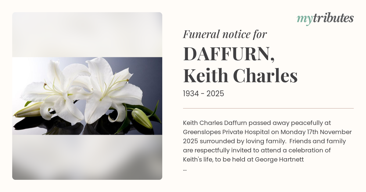 16°CKeith Charles Daffurn passed away peacefully at Greenslopes Private Hospital on Monday 17th November 2025 surrounded by loving family. Friends and family are respectfully invited to attend a celebration of Keith's life, to be held at George Hartnett Metropolitan Funerals Chapel, 224 Newnham Road, Mt Gravatt, Brisbane on Wednesday 26th November 2025 at 2:00pm.