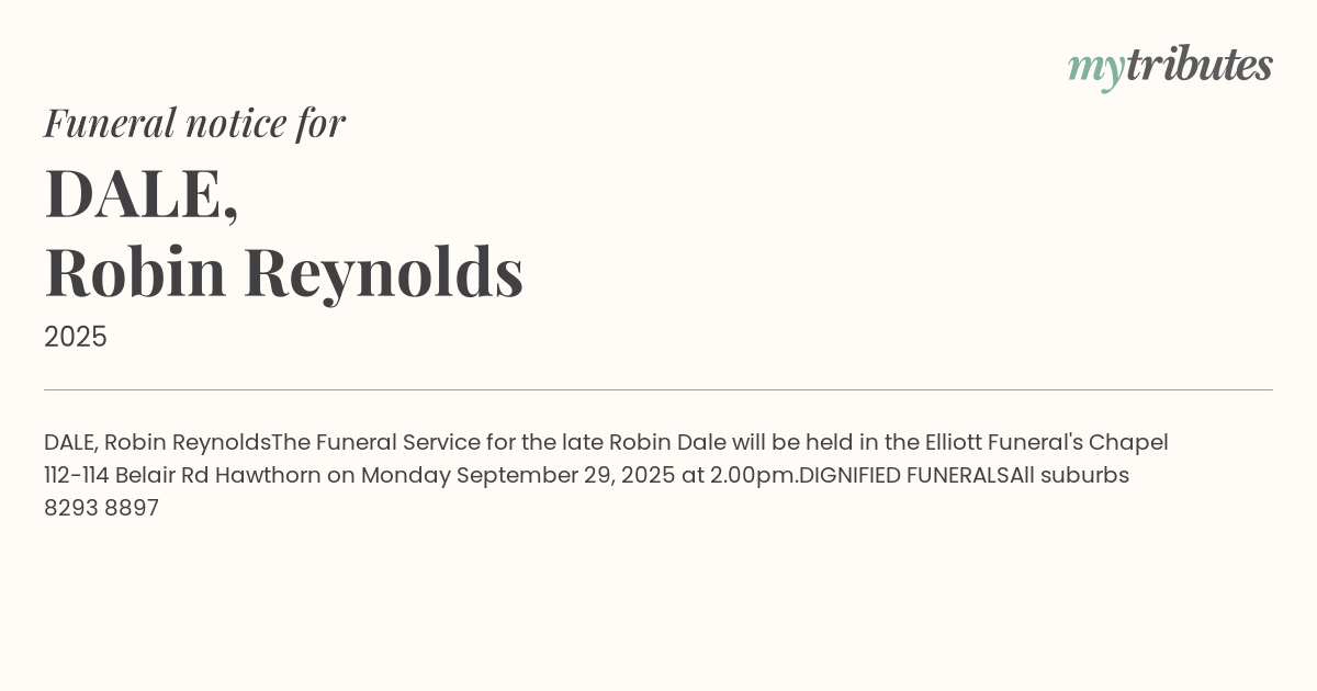 The Funeral Service for the late Robin Dale will be held in the Elliott Funeral's Chapel 112-114 Belair Rd Hawthorn on Monday September 29,