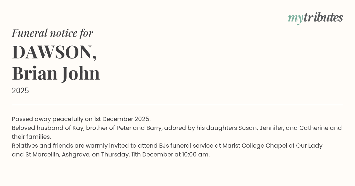 Relatives and friends are warmly invited to attend BJ’s funeral service at Marist College Chapel of Our Lady and St Marcellin, Ashgrove, on Thursday, 11th December at 10:00 am.