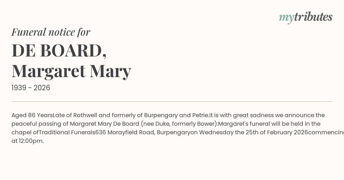 of Margaret Mary De Board (nee Duke, formerly Bower).