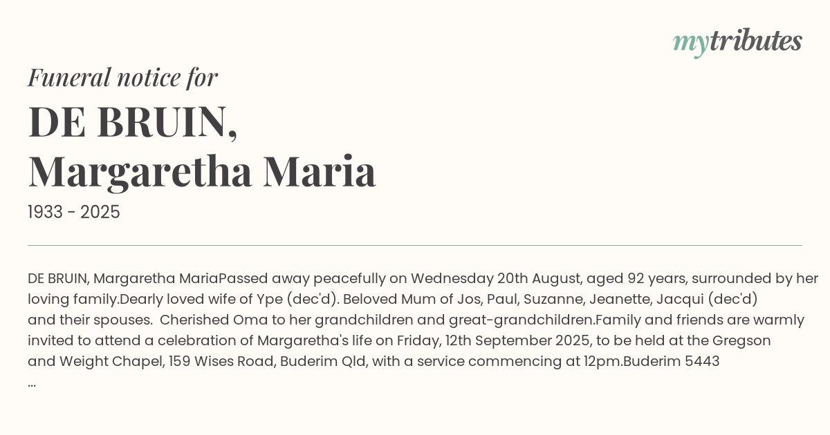 Family and friends are warmly invited to attend a celebration of Margaretha's life on Friday, 12th September 2025, to be held at the Gregson and Weight Chapel, 159 Wises Road, Buderim Qld, with a service commencing at 12pm.