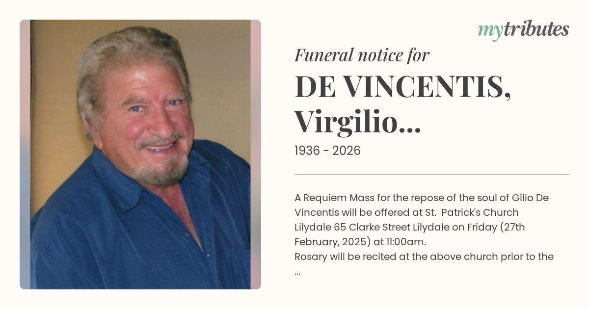 16°CA Requiem Mass for the repose of the soul of Gilio De Vincentis will be offered at St. Patrick's Church Lilydale 65 Clarke Street Lilydale on Friday (27th February, 2025) at 11:00am.