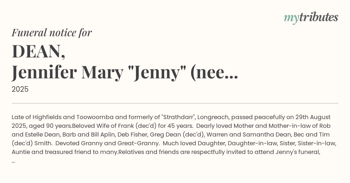 Relatives and friends are respectfully invited to attend Jenny's funeral, to be held at the T.S. Burstow Chapel, 1020 Ruthven Street (south), Toowoomba. Service commencing at 9.30am, Wednesday, 10th September 2025, followed by a private interment at the Garden of Remembrance, Toowoomba.