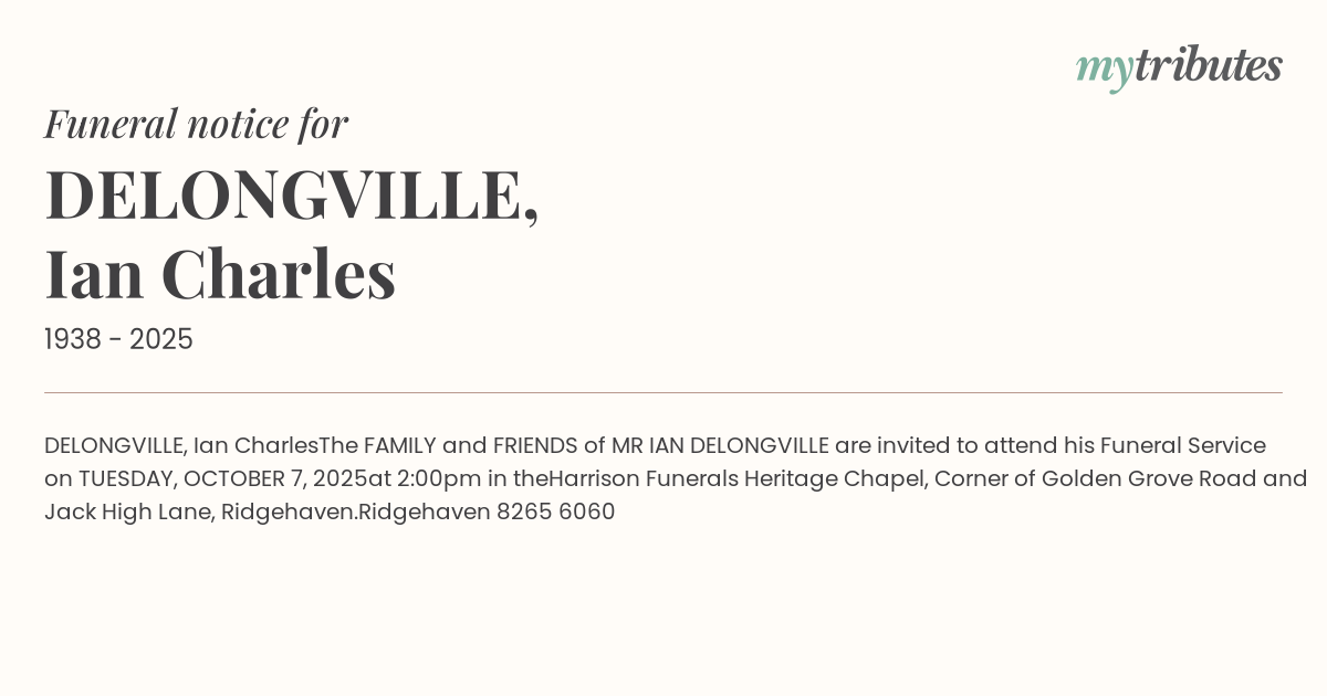The FAMILY and FRIENDS of MR IAN DELONGVILLE are invited to attend his Funeral Service on TUESDAY, OCTOBER 7, 2025