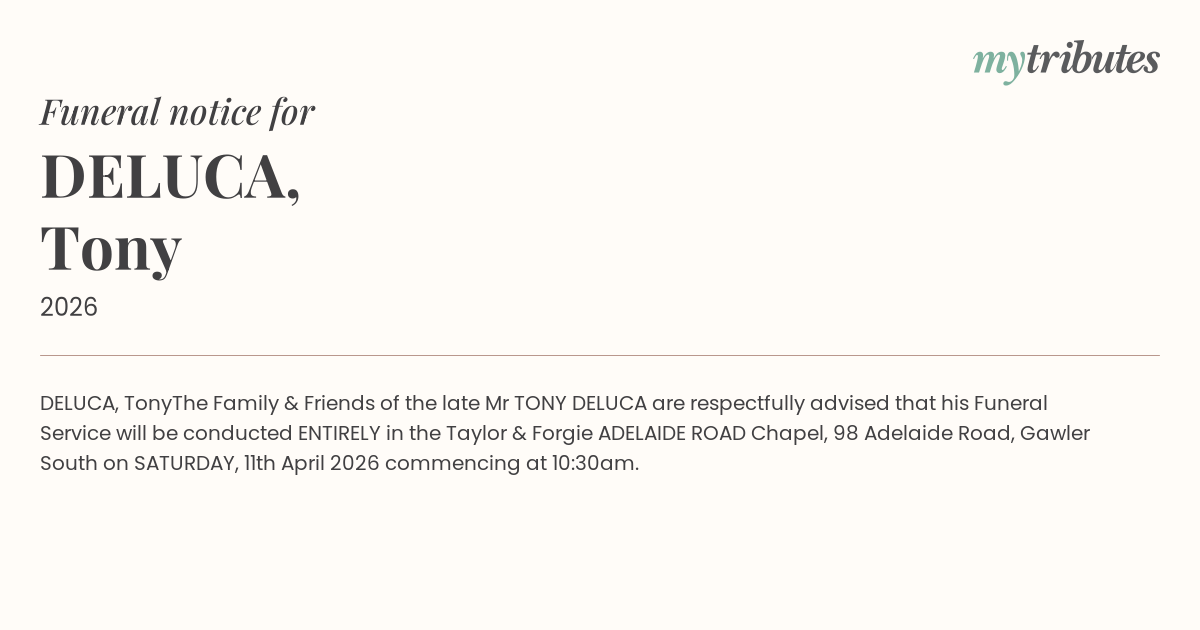 The Family & Friends of the late Mr TONY DELUCA are respectfully advised that his Funeral Service will be conducted ENTIRELY in the Taylor & Forgie ADELAIDE ROAD Chapel, 98 Adelaide Road, Gawler South on SATURDAY, 11th April 2026 commencing at 10:30am.