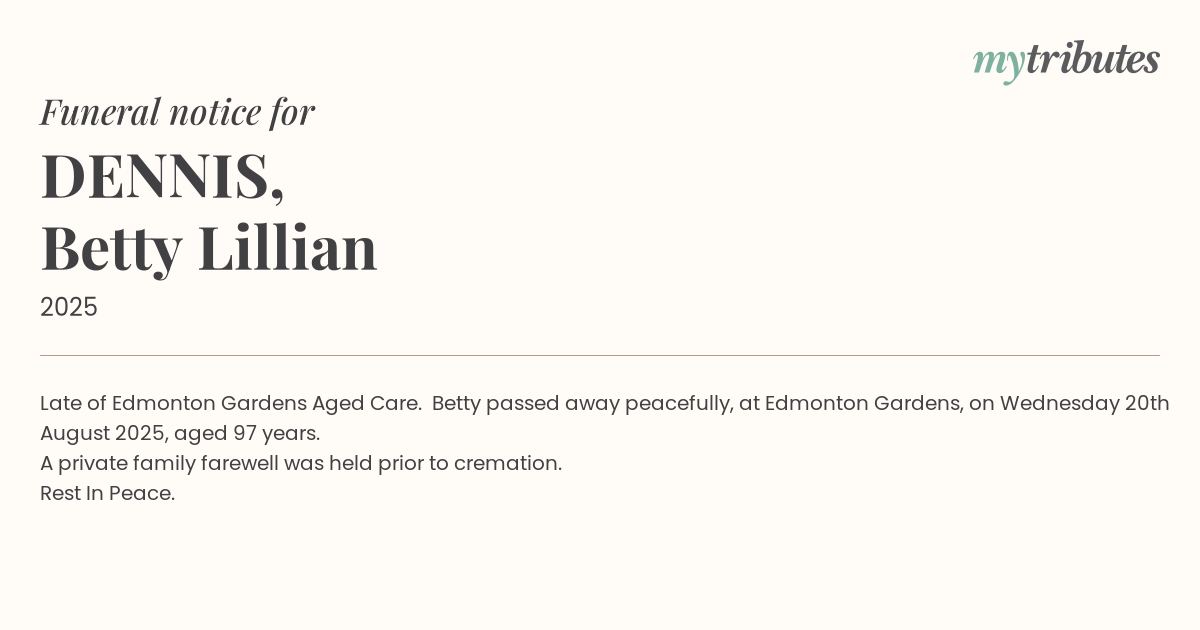 16°CLate of Edmonton Gardens Aged Care. Betty passed away peacefully, at Edmonton Gardens, on Wednesday 20th August 2025, aged 97 years.