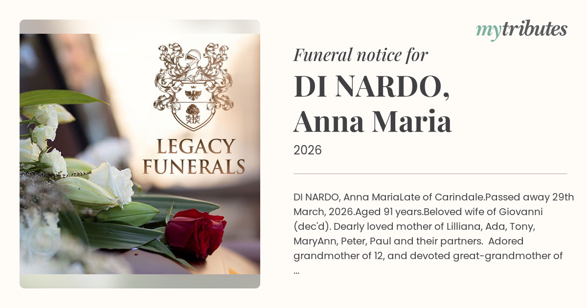 Family and friends of Maria are invited to attend the Rosary at 10.00 am followed by Funeral Mass at Our Lady of Graces Catholic Church, 100 Mayfield Rd, Carina, commencing at 10.30 am, on Monday 13th April, 2026.