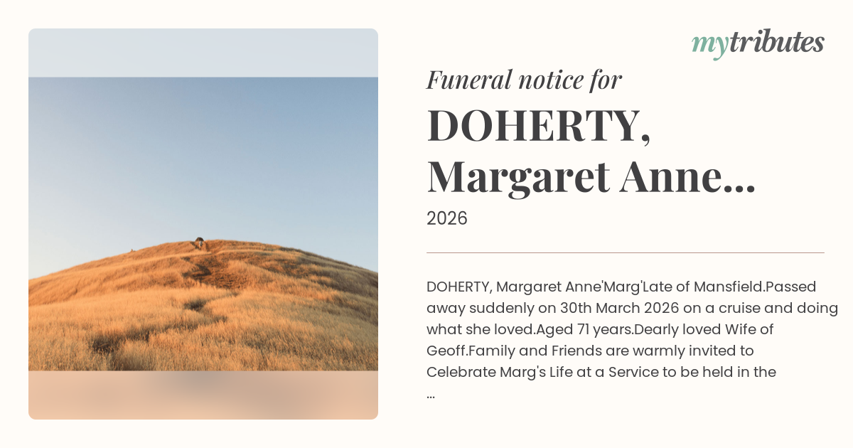 Family and Friends are warmly invited to Celebrate Marg's Life at a Service to be held in the East Chapel, Mt Thompson Crematorium, 329 Nursery Road, Holland Park on Tuesday 21st April 2026 commencing at 11:00am.