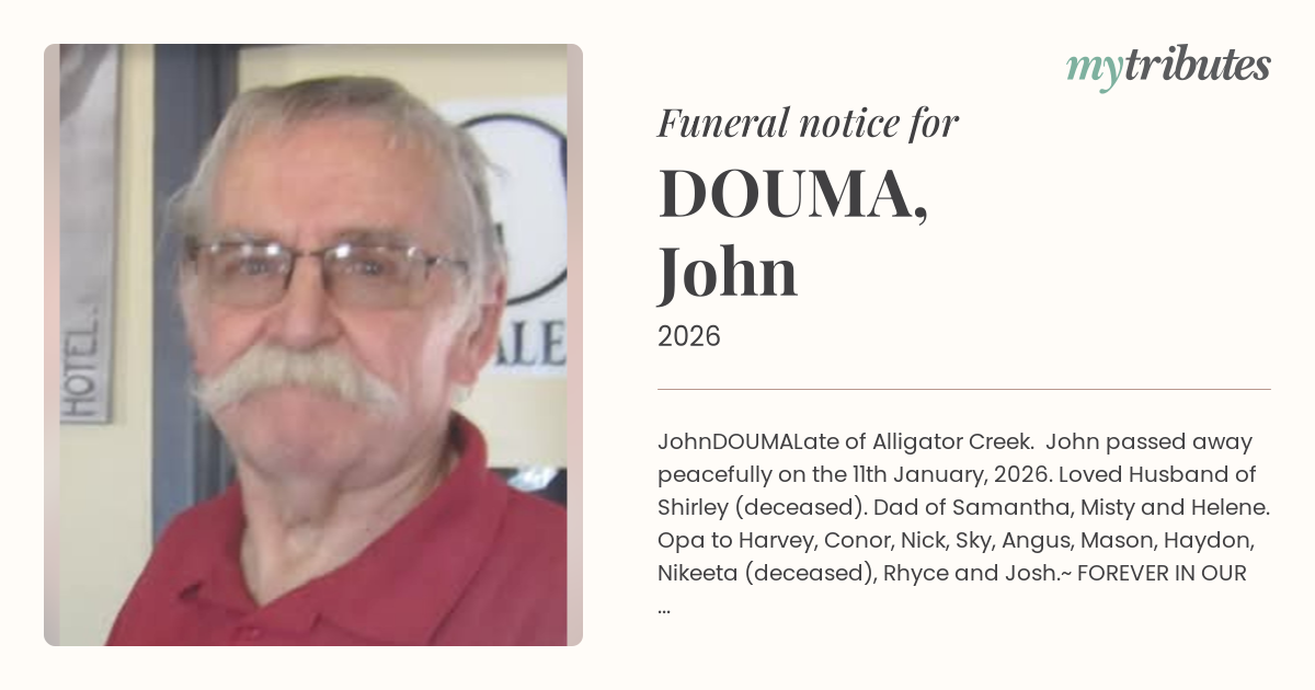 Late of Alligator Creek. John passed away peacefully on the 11th January, 2026. Loved Husband of Shirley (deceased). Dad of Samantha, Misty and Helene. Opa to Harvey, Conor, Nick, Sky, Angus, Mason, Haydon, Nikeeta (deceased), Rhyce and Josh.