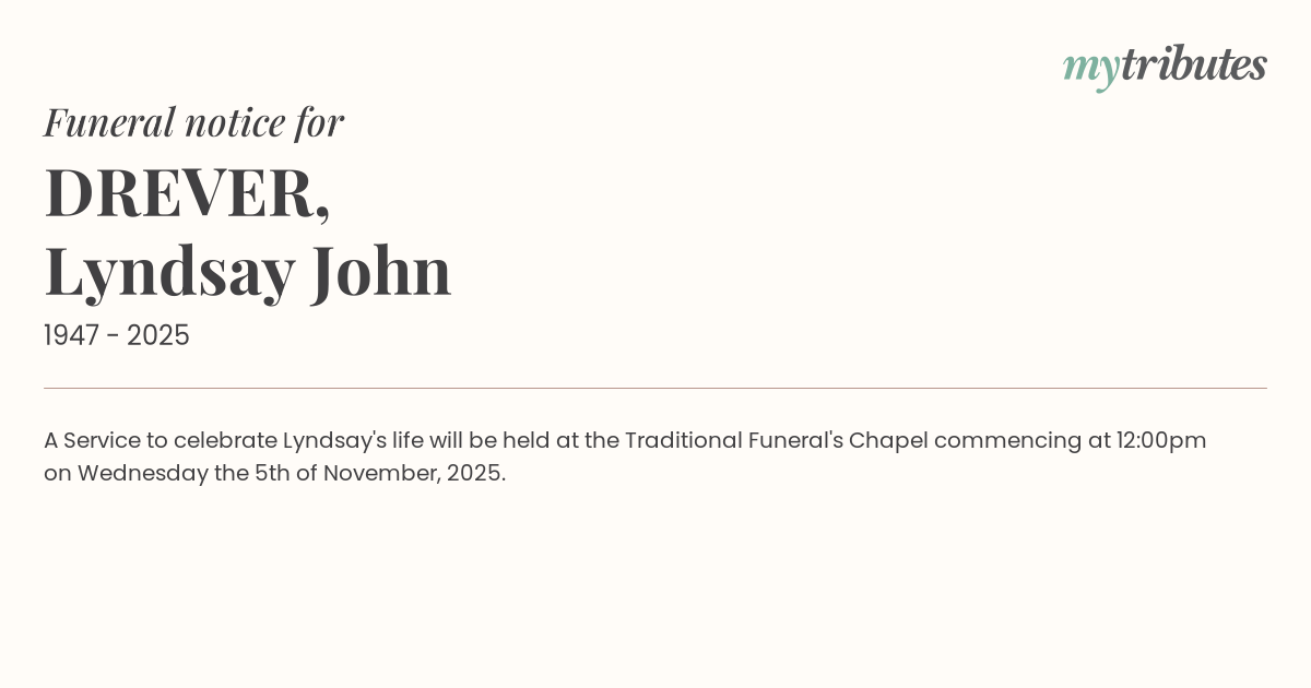 16°CA Service to celebrate Lyndsay's life will be held at the Traditional Funeral's Chapel commencing at 12:00pm on Wednesday the 5th of November, 2025.