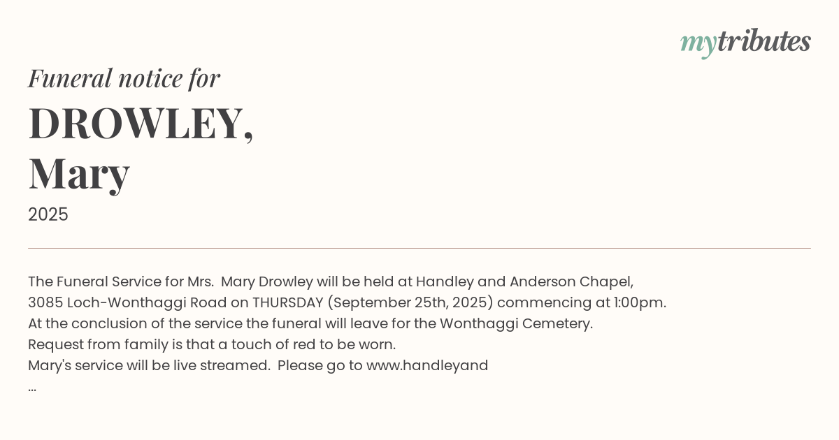 16°CThe Funeral Service for Mrs. Mary Drowley will be held at Handley and Anderson Chapel,
