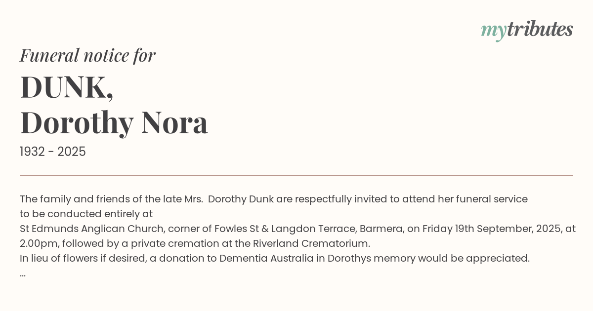 16°CThe family and friends of the late Mrs. Dorothy Dunk are respectfully invited to attend her funeral service to be conducted entirely at