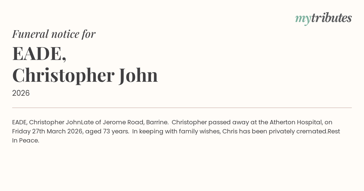 Late of Jerome Road, Barrine. Christopher passed away at the Atherton Hospital, on Friday 27th March 2026, aged 73 years. In keeping with family wishes, Chris has been privately cremated.