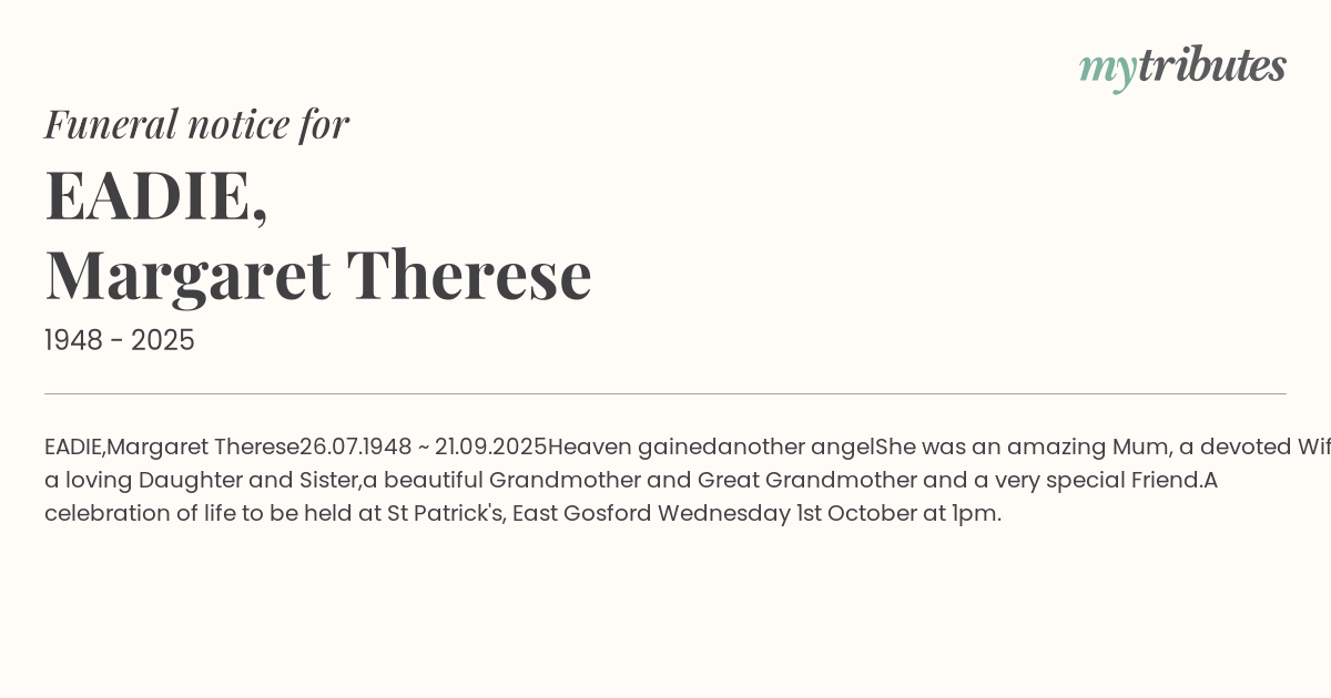 A celebration of life to be held at St Patrick's, East Gosford Wednesday 1st October at 1pm.
