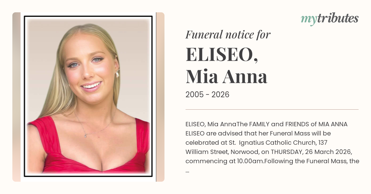 The FAMILY and FRIENDS of MIA ANNA ELISEO are advised that her Funeral Mass will be celebrated at St. Ignatius Catholic Church, 137 William Street, Norwood, on THURSDAY, 26 March 2026, commencing at 10.00am.