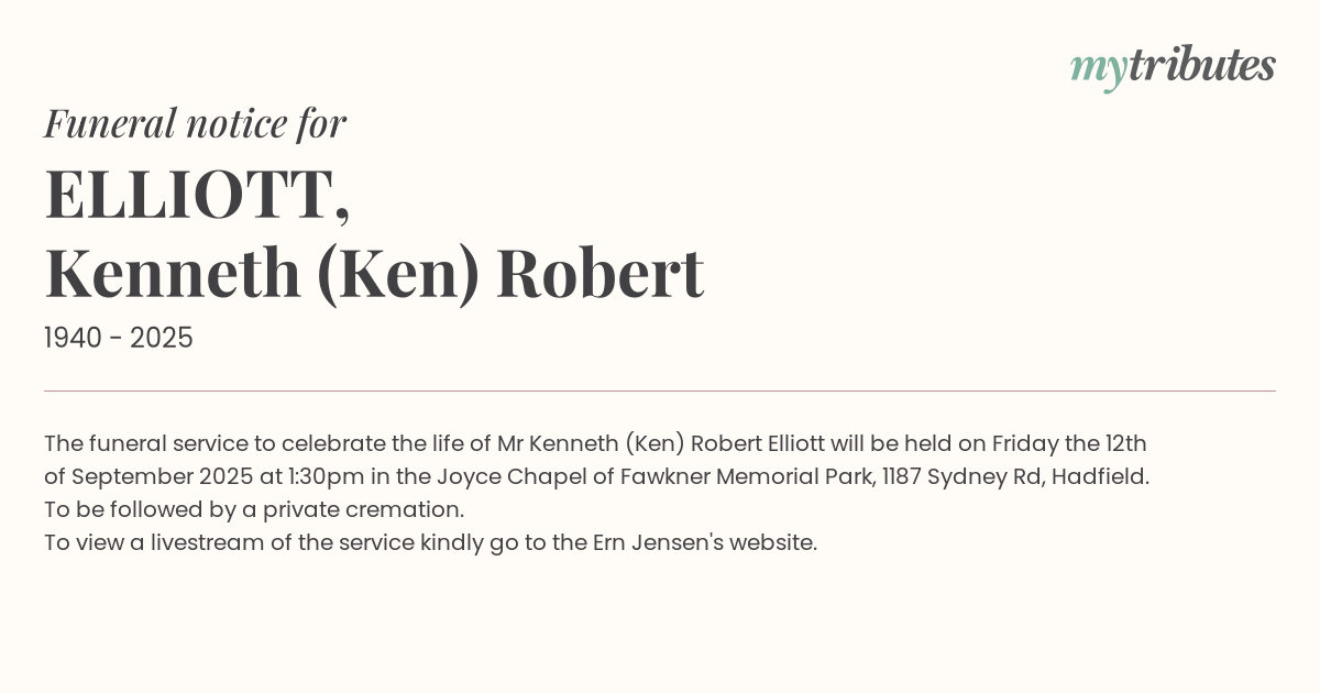16°CThe funeral service to celebrate the life of Mr Kenneth (Ken) Robert Elliott will be held on Friday the 12th of September 2025 at 1:30pm in the Joyce Chapel of Fawkner Memorial Park, 1187 Sydney Rd, Hadfield.