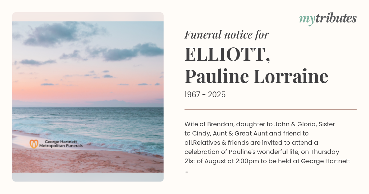 Relatives & friends are invited to attend a celebration of Pauline's wonderful life, on Thursday 21st of August at 2:00pm to be held at George Hartnett Metropolitan Funerals Kelvin Grove, 270 Kelvin Grove Road, Kelvin Grove, QLD 4059.