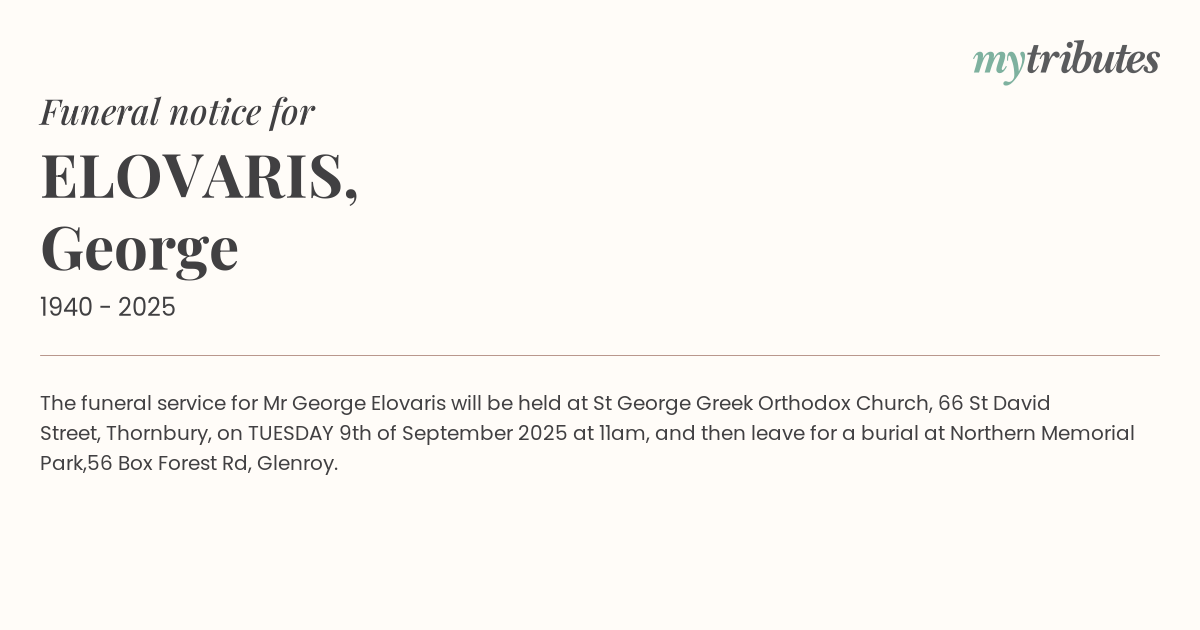 16°CThe funeral service for Mr George Elovaris will be held at St George Greek Orthodox Church, 66 St David Street, Thornbury, on TUESDAY 9th of September 2025 at 11am, and then leave for a burial at Northern Memorial Park,56 Box Forest Rd, Glenroy.