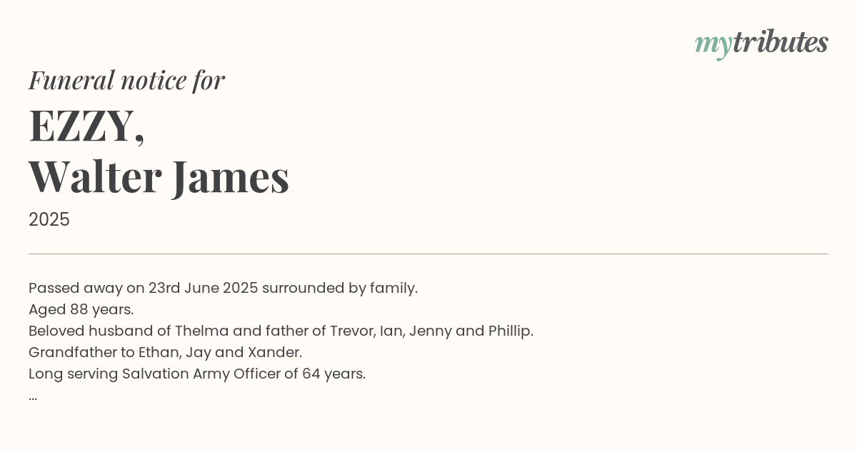 A celebration of Walter's life will be held in the Salvation Army Hall at Redcliffe on Friday 4th July 2025 commencing at 11am. The service will be recorded if you cannot attend.