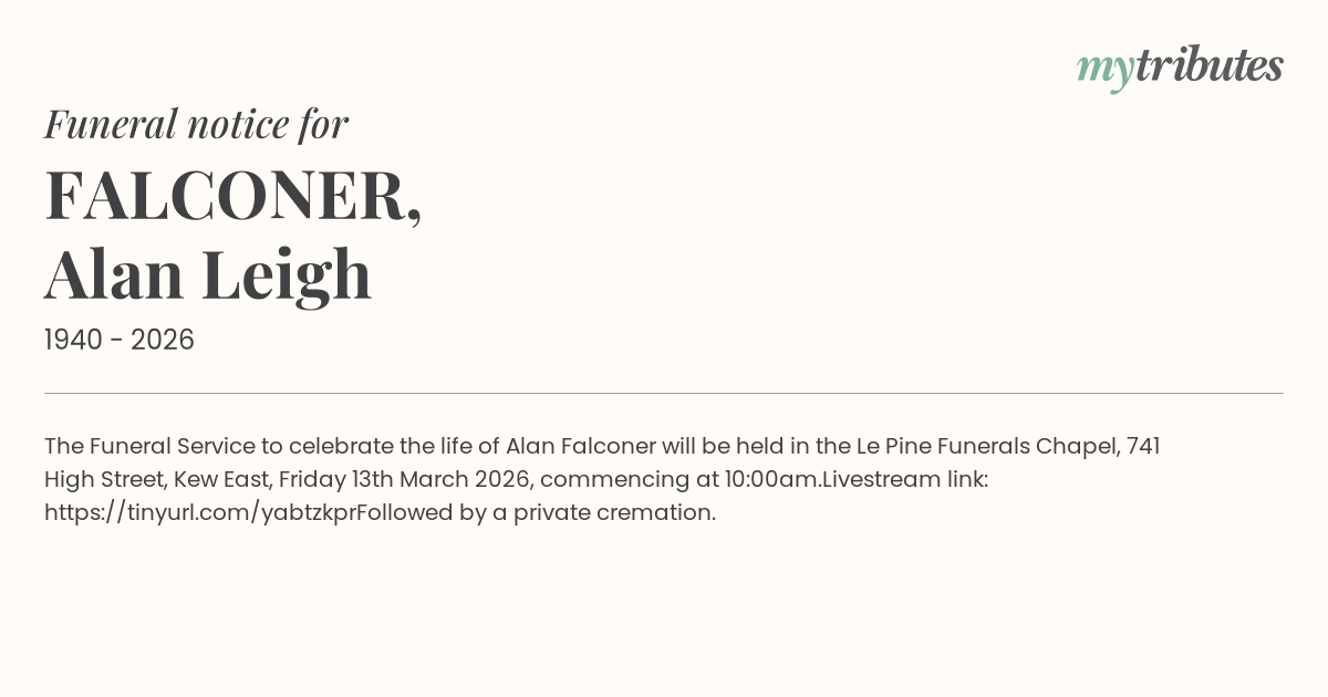 16°CThe Funeral Service to celebrate the life of Alan Falconer will be held in the Le Pine Funerals Chapel, 741 High Street, Kew East, Friday 13th March 2026, commencing at 10:00am.