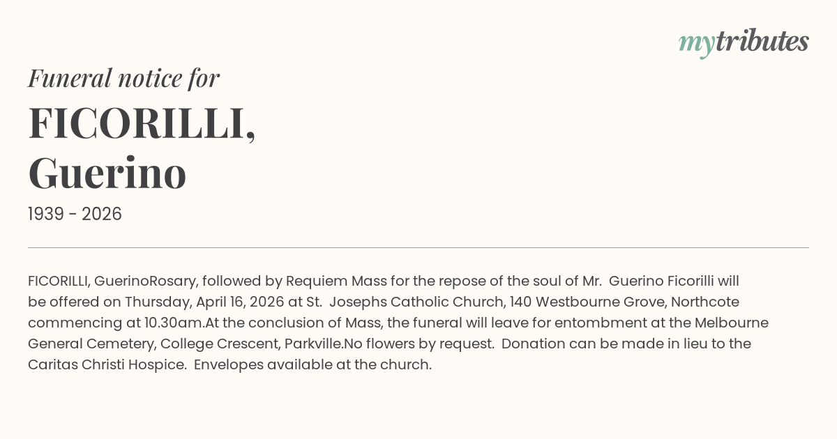 At the conclusion of Mass, the funeral will leave for entombment at the Melbourne General Cemetery, College Crescent, Parkville.