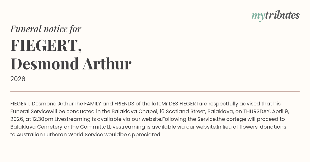 will be conducted in the Balaklava Chapel, 16 Scotland Street, Balaklava, on THURSDAY, April 9, 2026, at 12.30pm.