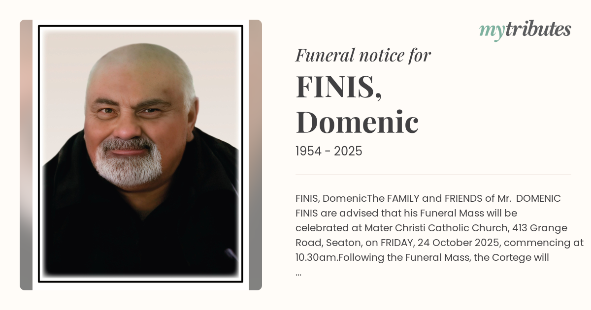 The FAMILY and FRIENDS of Mr. DOMENIC FINIS are advised that his Funeral Mass will be celebrated at Mater Christi Catholic Church, 413 Grange Road, Seaton, on FRIDAY, 24 October 2025, commencing at 10.30am.