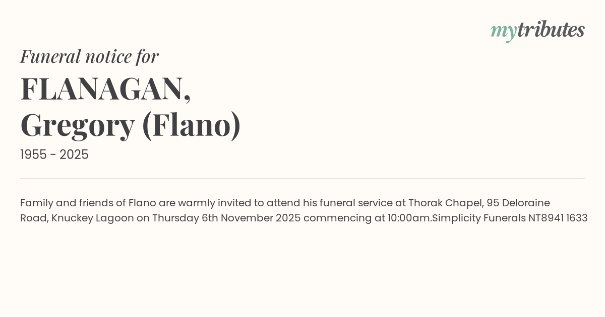 16°CFamily and friends of Flano are warmly invited to attend his funeral service at Thorak Chapel, 95 Deloraine Road, Knuckey Lagoon on Thursday 6th November 2025 commencing at 10:00am.