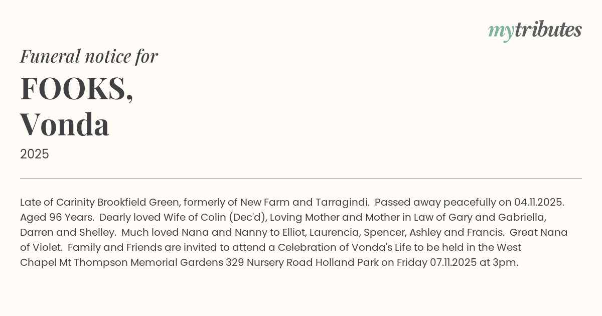 16°CLate of Carinity Brookfield Green, formerly of New Farm and Tarragindi. Passed away peacefully on 04.11.2025. Aged 96 Years. Dearly loved Wife of Colin (Dec'd), Loving Mother and Mother in Law of Gary and Gabriella, Darren and Shelley. Much loved Nana and Nanny to Elliot, Laurencia, Spencer, Ashley and Francis. Great Nana of Violet. Family and Friends are invited to attend a Celebration of Vonda's Life to be held in the West Chapel Mt Thompson Memorial Gardens 329 Nursery Road Holland Park on Friday 07.11.2025 at 3pm.