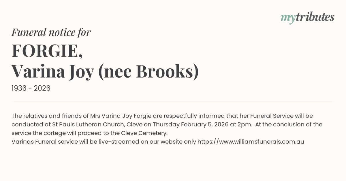 16°CThe relatives and friends of Mrs Varina Joy Forgie are respectfully informed that her Funeral Service will be conducted at St Paul’s Lutheran Church, Cleve on Thursday February 5, 2026 at 2pm. At the conclusion of the service the cortege will proceed to the Cleve Cemetery.