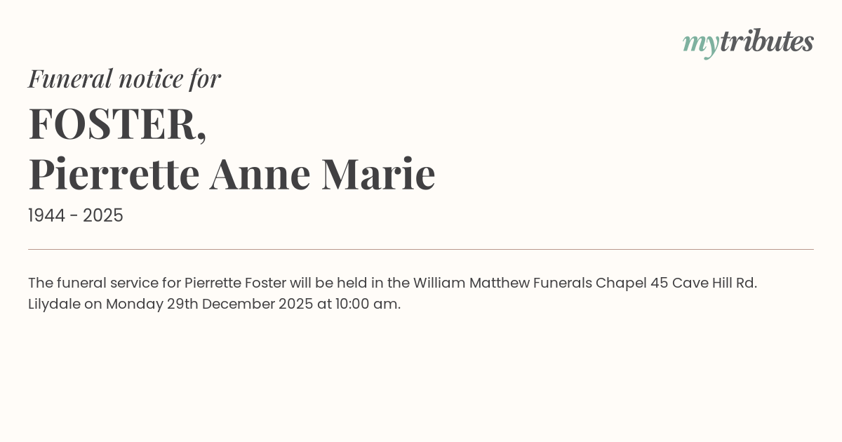 16°CThe funeral service for Pierrette Foster will be held in the William Matthew Funerals Chapel 45 Cave Hill Rd. Lilydale on Monday 29th December 2025 at 10:00 am.