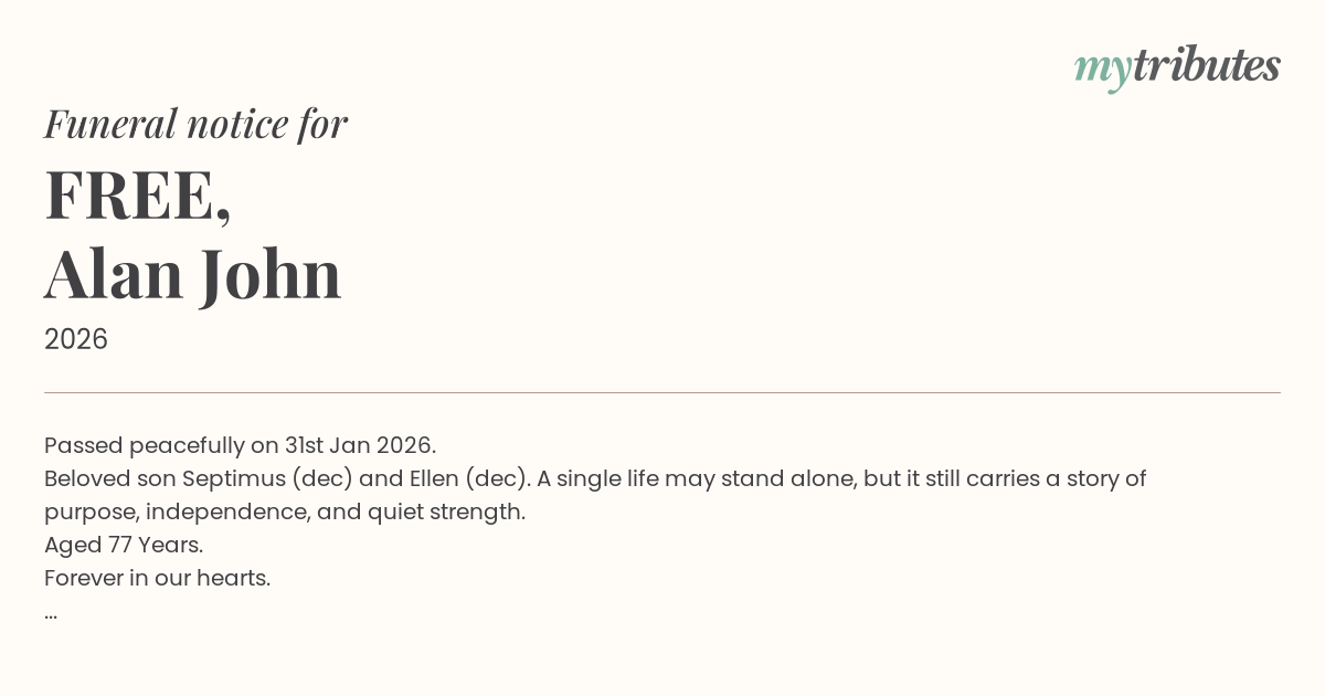 Alan’s family and friends are warmly invited to attend his funeral service to be held at St. Joseph’s Riverwood on Wednesday 11 Feb 2026 at 10am followed by burial service at Rookwood Catholic Cemetery at 11.30am on the same day.