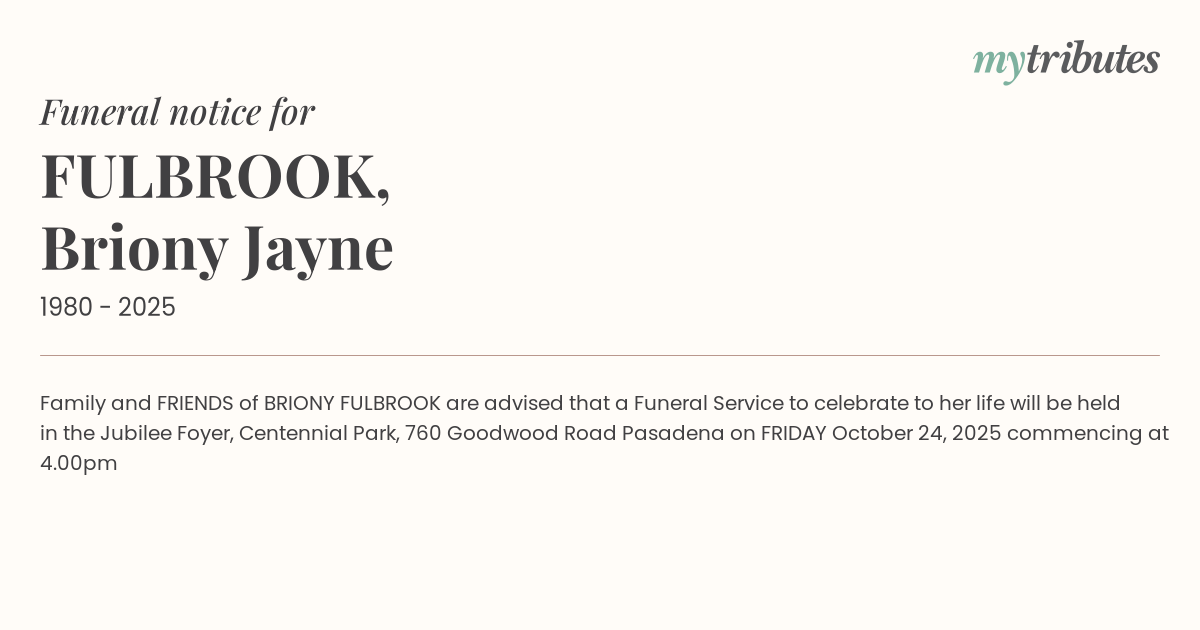 16°CFamily and FRIENDS of BRIONY FULBROOK are advised that a Funeral Service to celebrate to her life will be held in the Jubilee Foyer, Centennial Park, 760 Goodwood Road Pasadena on FRIDAY October 24, 2025 commencing at 4.00pm